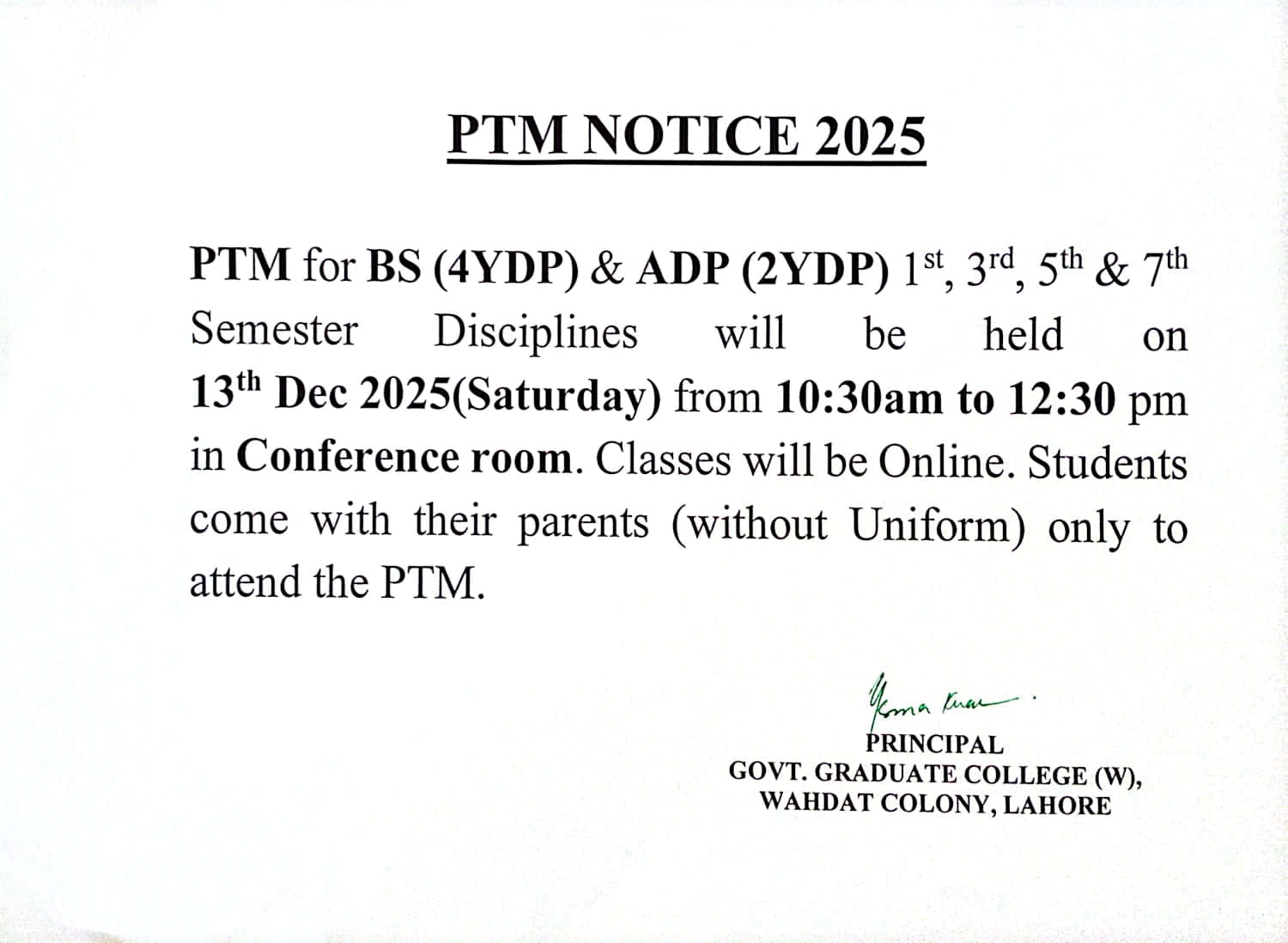 On Saturday, 13 December 2025, the Parents-Teacher Meeting (PTM) for the BS 4-Year Program and ADP 2-Year Program was held in the college conference room from 10:30 a.m. to 12:30 p.m. The meeting was organized by the College Implementation Committee( Dr Alya maimoona, Mrs. Saima Iftikhar, Mrs Ammara Zafarulla, Mrs. Dure Aden, Dr.Ayesha Kashif under the guidance of Principal Dr. Uzma Khanum. Girl guides and proctors were assigned to assist parents in connecting with their respective teachers.